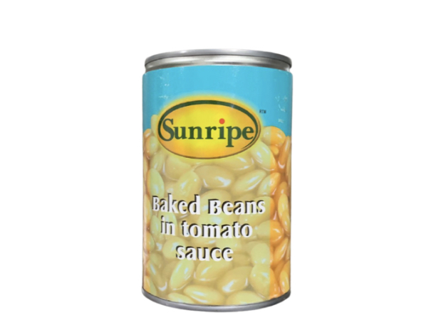Tasty baked beans in rich tomato sauce from Sunripe. Great as a side or quick snack.